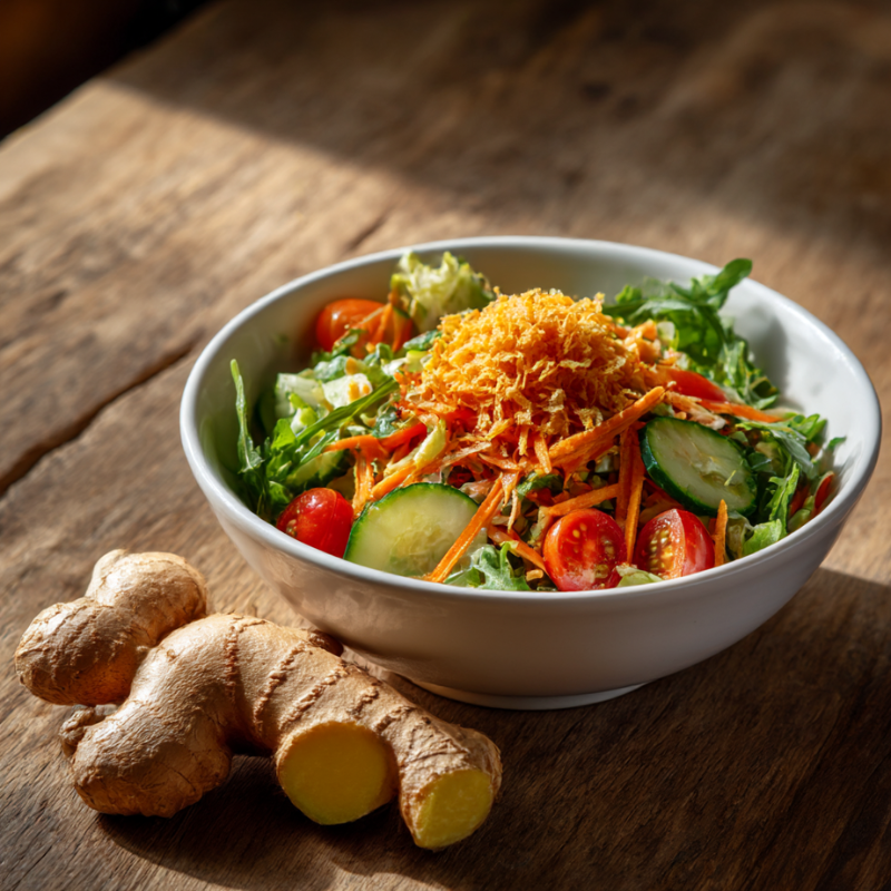 Uma opção leve e cheia de sabor é incluir o gengibre em saladas naturais. Além de realçar o frescor dos ingredientes, o gengibre pode auxiliar na digestão e contribuir com uma sensação de leveza após as refeições.