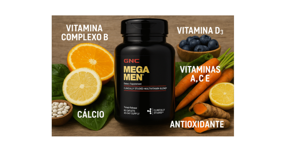 O Mega Men da GNC é um multivitamínico formulado especialmente para homens, com mais de 30 ingredientes selecionados para oferecer suporte completo à energia, imunidade, saúde cardiovascular, foco mental e vitalidade no dia a dia.